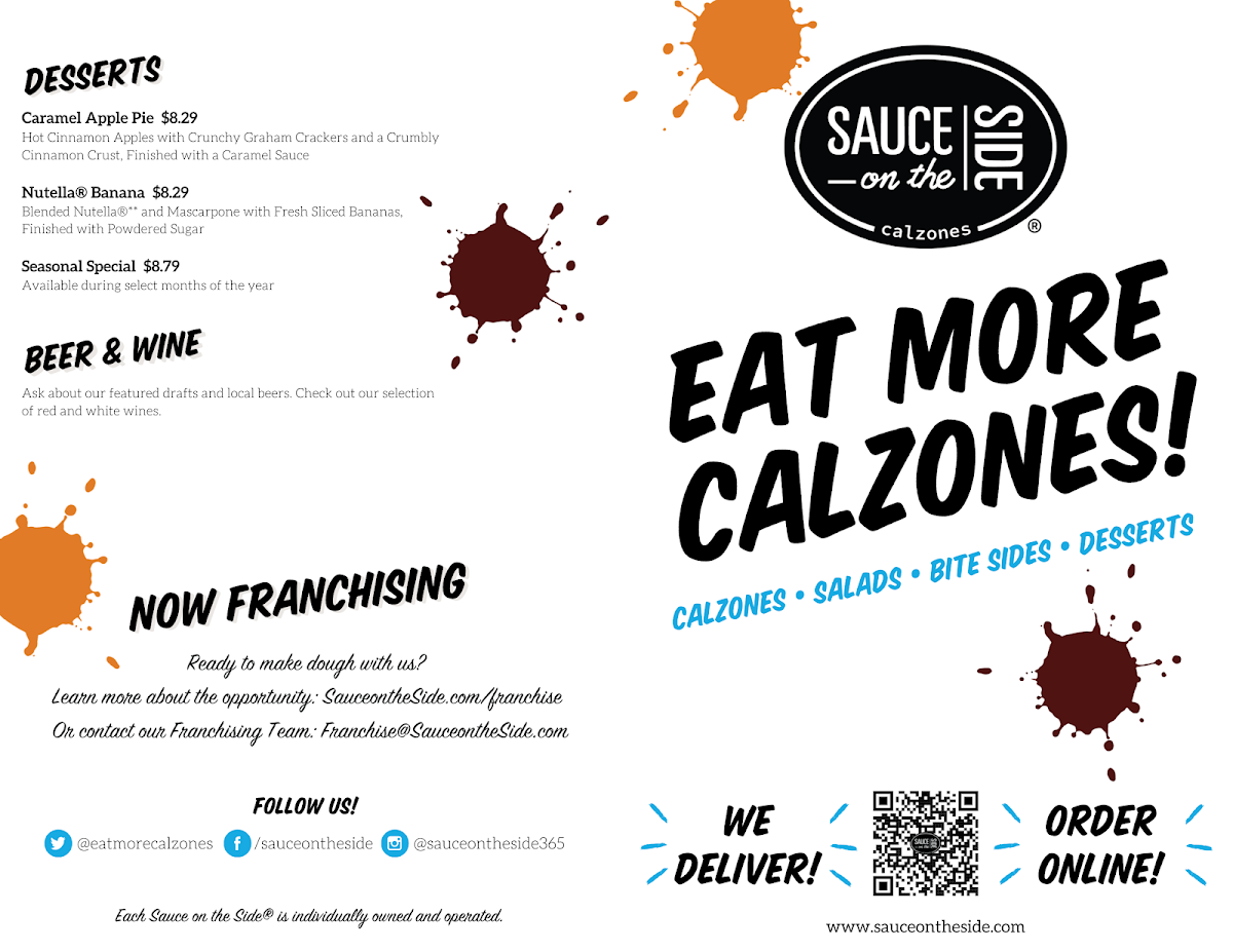 Our Vegan Calzone. HAPPY LITTLE PLANTS® Pepperoni / Vegan Mozzarella / White Onion / Green Peppers / Roasted Garlic Puree / Served with Spicy Red Sauce.